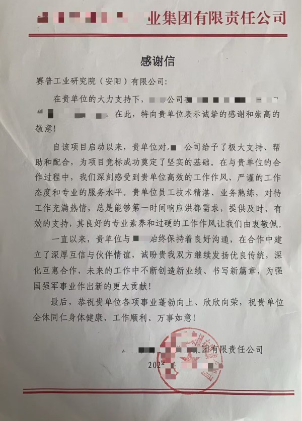 近期,賽普工業(yè)研究院(安陽)有限公司(以下簡稱“賽普公司”)再次收到來自客戶的感謝信,客戶對(duì)公司在某特種裝備生產(chǎn)任務(wù)中提供的卓越支持予以高度評(píng)價(jià)。今年以來,賽普公司已多次獲得客戶的書面感謝和電話感謝。贊譽(yù)的背后,是市場與客戶對(duì)賽普公司技術(shù)實(shí)力、服務(wù)品質(zhì)與履約精神的高度認(rèn)可與信賴。